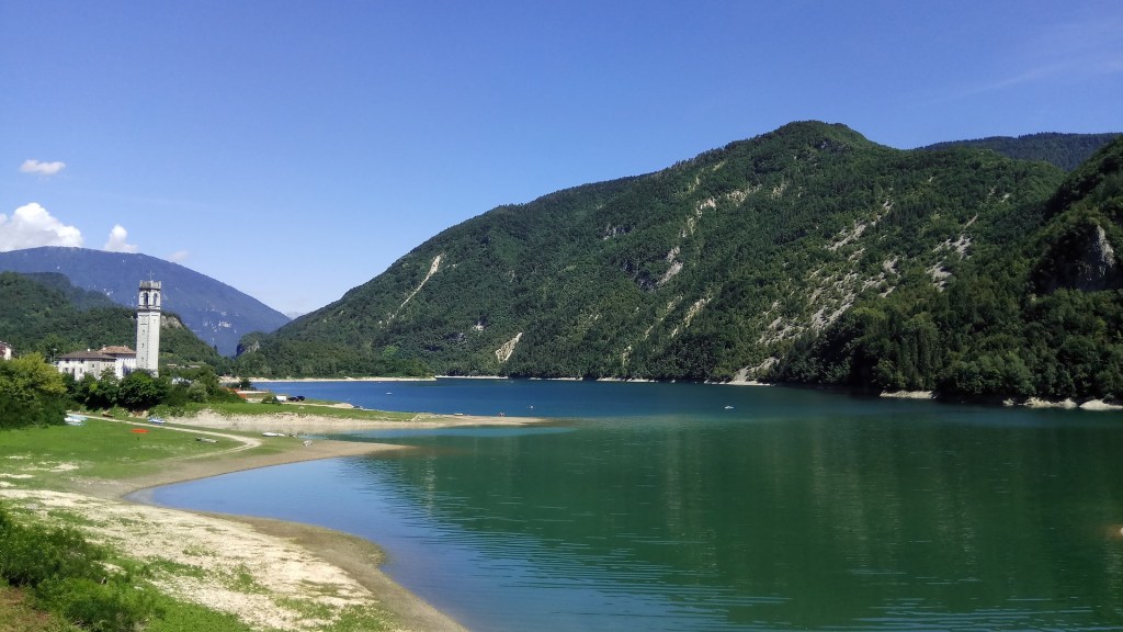Piccola sosta caffè al bar del campeggio e poi ci incamminiamo verso la seconda parte del percorso che ci porterà lungo il Lago del Corlo. Lì ci sono barche, pedalò e canoe a disposizione dei clienti. Sulle rive qualche ristorantino o pizzeria e ampi spazi attrezzati, come il Parco della Campagnola, con tavoli, panche, un’area barbecue e tanta gente: famiglie, amici, bambini. Nella piccola piazza della frazione di Rocca di Arsiè c’è il grazioso albergo Venezia, con le persiane azzurre. E un campanile senza chiesa.