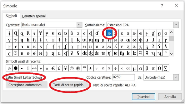 Nella tabella, dai simboli selezionare “ə”. Fare attenzione che in basso a sinistra compaia la descrizione “Latin Small Letter Schwa”, perché vi sono altri simboli molto simili che tuttavia non rappresentano il suono “schwa”. Quindi, cliccare su TASTI DI SCELTA RAPIDA.